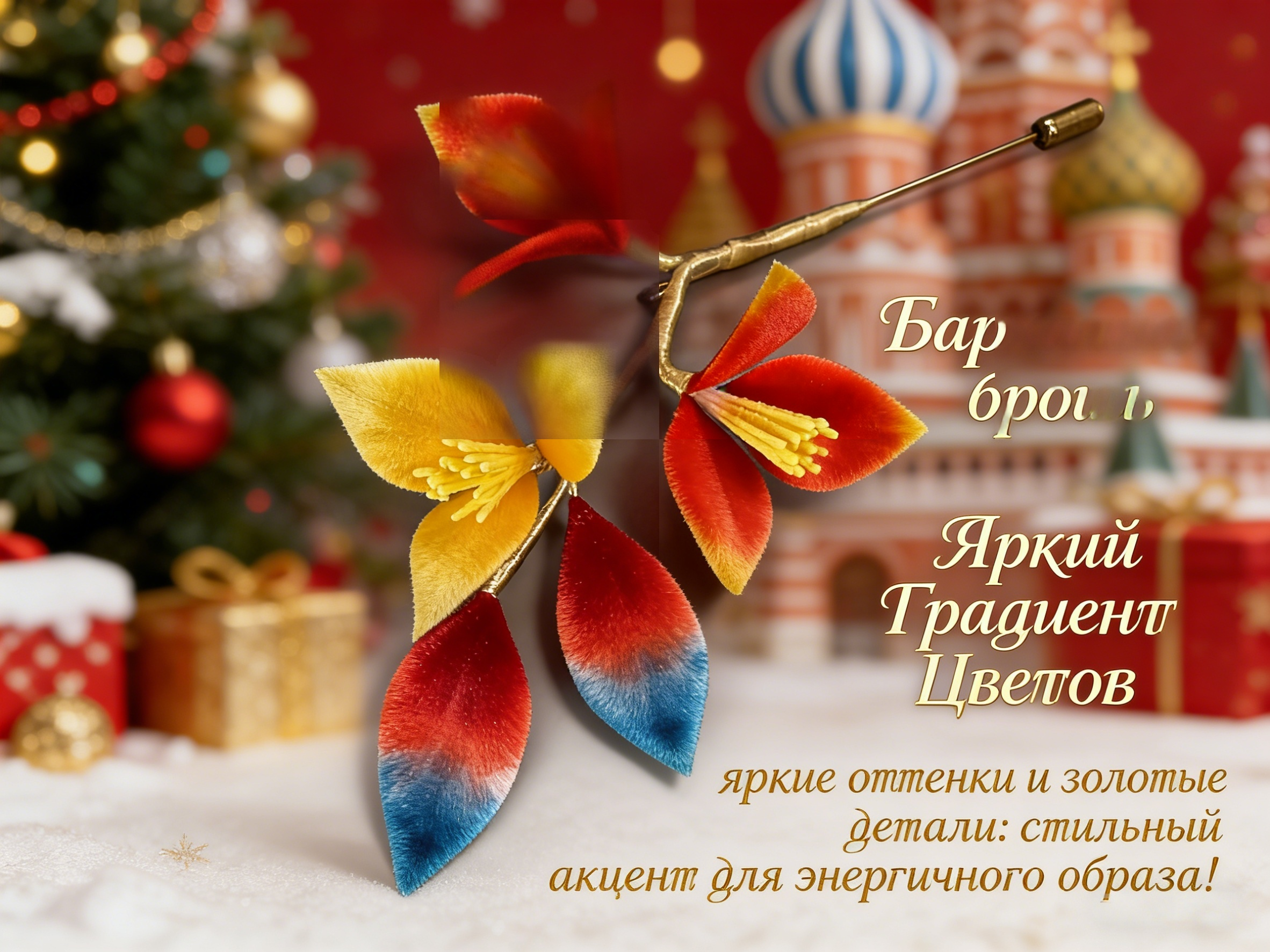 Бархатная брошь «Яркий Градиент Цветов» — ручная работа с золотым сердцем