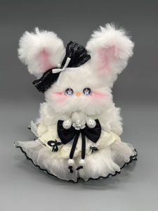 Эта кукла-кролик с пушистой, словно облако, шерстью грациозно сидит, воплощая элегантность, неподвластную времени. Чёрный кружевной бант украшает её левое ухо, а многослойная юбка из органзы создаёт королевский силуэт. Атласный бант на груди украшен вышитыми вручную перламутровыми бусинами, каждая из которых мерцает на свету, словно слезинка. Когда она смотрит на вас своими стеклянными чёрными глазами, кажется, что она только что покинула чаепитие у Алисы, а её юбка всё ещё покрыта сказочной звёздной пылью.